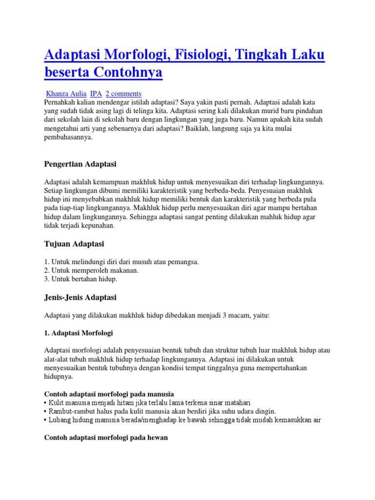 Pengertian cara macam tujuan dan contoh dalam cara beradaptasi tidak hanya pada manusia dan hewan saja yang dapat melakukan proses adaptasi. Seperti sebelumnya sudah dijelaskan apa itu adaptasi berikut jenis jenisnya maka pada saat ini akan dijelaskan contoh contoh yang lebih lengkap dari ketia jenis adaptasi tersebut. Hewan ruminansia misalnya sapi kambing kerbau. Autotomi adalah teknik bertahan hidup dengan cara mengorbankan salah satu bagian tubuh. Beruang kutub memiliki rambut yang sangat tebal yang berguna untuk bertahan hidup pada suhu hingga kurang dari 0 derajat. Cara itu merupakan salah satu adaptasi morfologi.