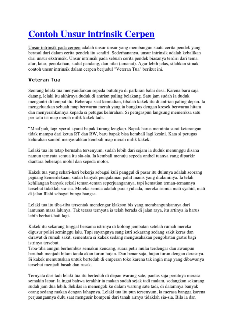 Sudut pandang cara pandang penulis dalam membuat cerita. Impian rena hidup sebatang kara dengan neneknya di rumah peot yang berada di pinggir desa. Di bawah ini akan kami berikan tentang contoh cerpen cerita pendek yang di dalamnya terdapat unsur intrinsik yang merupakan elemen penting di dalam sebuah alur cerita. Ada beberapa tahapan alur yang harus ada dalam sebuah cerita seperti pengenalan penanjakan klimaks anti klimaks dan tahap penyelesaian. Cerpen ini merupakan sebuah bentuk dari prosa naratif yang fiktif. Alur atau plot urutan berjalannya sebuah cerita dalam cerpen.