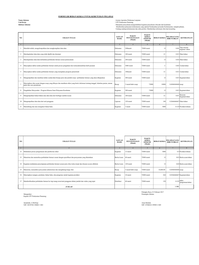 Contoh analisis beban kerja pns. Penyusunan kebutuhan pegawai tersebut terdiri dari tugas pokok dan fungsi analisis dan informasi jabatan seperti nama dan ikhtisar jabatan uraian tugas kemudian analisis beban kerja kebutuhan pegawai dan peta jabatan kebutuhan. Posting pada s1 smk umum ditag analisa beban kerja puskesmas analisa beban kerja sdm pdf analisa kerja analisis beban kerja guru analisis beban kerja karyawan hotel analisis beban kerja kementerian keuangan analisis beban kerja pdf analisis beban kerja pns pdf analisis jabatan dan analisis beban kerja analisis tenaga kerja analisis tenaga kerja adalah apa yang dimaksud perkiraan. Pegawai negeri sipil pns dituntut untuk bekerja secara professional. Menyusun rencana kerja kantor berdasar rencana strategis untukmemberikan arah dan target kegiatan. Aplikasi analisis beban kerja abk wong ndeso 2017 03 06t1440000700 50 stars based on 35 reviews analisis jabatan adalah merupakan sebuah proses metode serta teknik untuk mendapatkan data jabatan yang diolah menjadi informasi jabatan. Pengertian analisis beban kerja analisa beban kerja adalah proses untuk menetapkan jumlah jam kerja orang yang digunakan atau dibutuhkan untuk merampungkan suatu pekerjaan dalam waktu tertentu atau dengan kata lain analisis beban kerja bertujuan untuk menentukan berapa jumlah personalia dan berapa jumlah tanggung jawab atau beban kerja yang tepat dilimpahkan kepada seorang petugas.