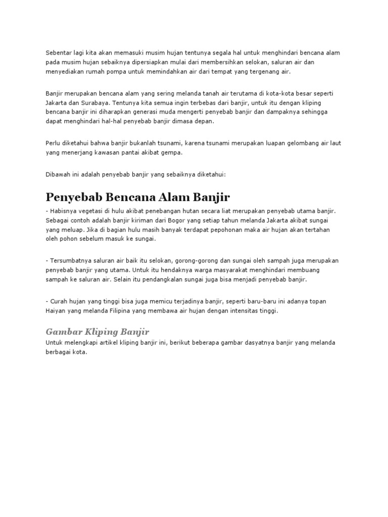 Contoh artikel tentang banjir. Banjir yang terjadi sejak senin kemarin mengakibatkan hampir seluruh akses masuk menuju kabupaten pacitan terendam banjir. Written by unknown on thursday may 21 2015 91200 am. Contoh karya ilmiah tentang banjir. Flood the word flood means the inability of rivers lakes drainage or other waterways to accommodate massive quantities of water so the water overflow and enters the surrounding area. Contoh artikel tentang banjir unknown banjir. Contoh artikel pendek dan singkat jika sebelumnya kita telah memberikan kumpulan contoh autobiografi maka kita akan coba membagikan contoh artikel pendek yang kami kumpulkan dari berbagai sumber untuk memudahkan anda dalam memilihnya artikel pendek yang akan kami berikan ini terdiri dari berbagai aspek mulai dari artikel kesehatan motivasi pendidikan lingkungan dan teknologi.