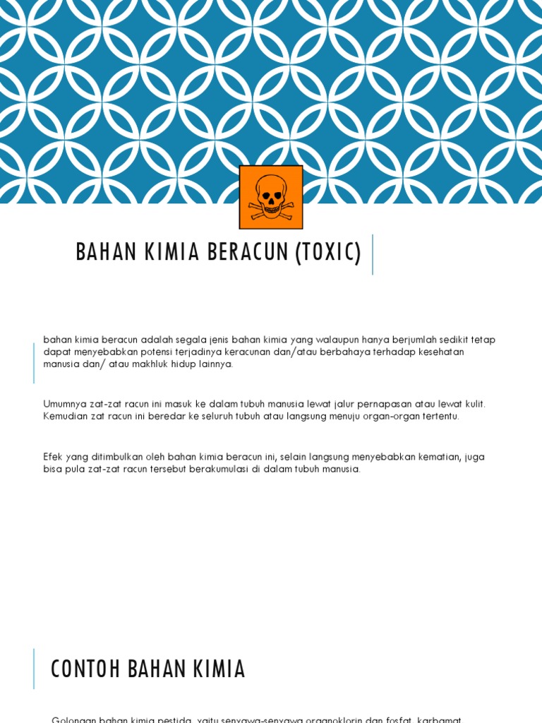 Racun atau bahan kimia yang beracun adalah bahan kimia yang dalam jumlah kecil menimbulkan keracunan pada manusia atau mahluk hidup lainnya atau bahan kimia yang dapat menyebabkan bahaya terhadap kesehatan manusia atau menyebabkan kematian apabila terserap ke dalam tubuh karena tertelan lewat pernafasan atau kontak lewat kulit. Tanpa kita mengenal pengertian jenis dan cara pengelolaannya dengan benar akan memberikan dampak yang berkepanjangan dan beruntun terhadap manusia dan lingkungan. Bahan kimia beracun bahaya meledak dan terbakar. Simbol selanjutnya adalah flamable yang berarti bahan kimia yang mempunyai titik nyala rendah mudah terbakar dengan api bunsen permukaan metal panas atau loncatan bunga api. Klasifikasi bahan kimia dibagi menjadi 9 yaitu toxic corrosive flammable explosive oxidation reaktif terhadap asam reaktif terhadap air gas bertekanan radioktive. Sekarang saya akan menjelaskan tentang bahan kimia beracun toxic toxic.