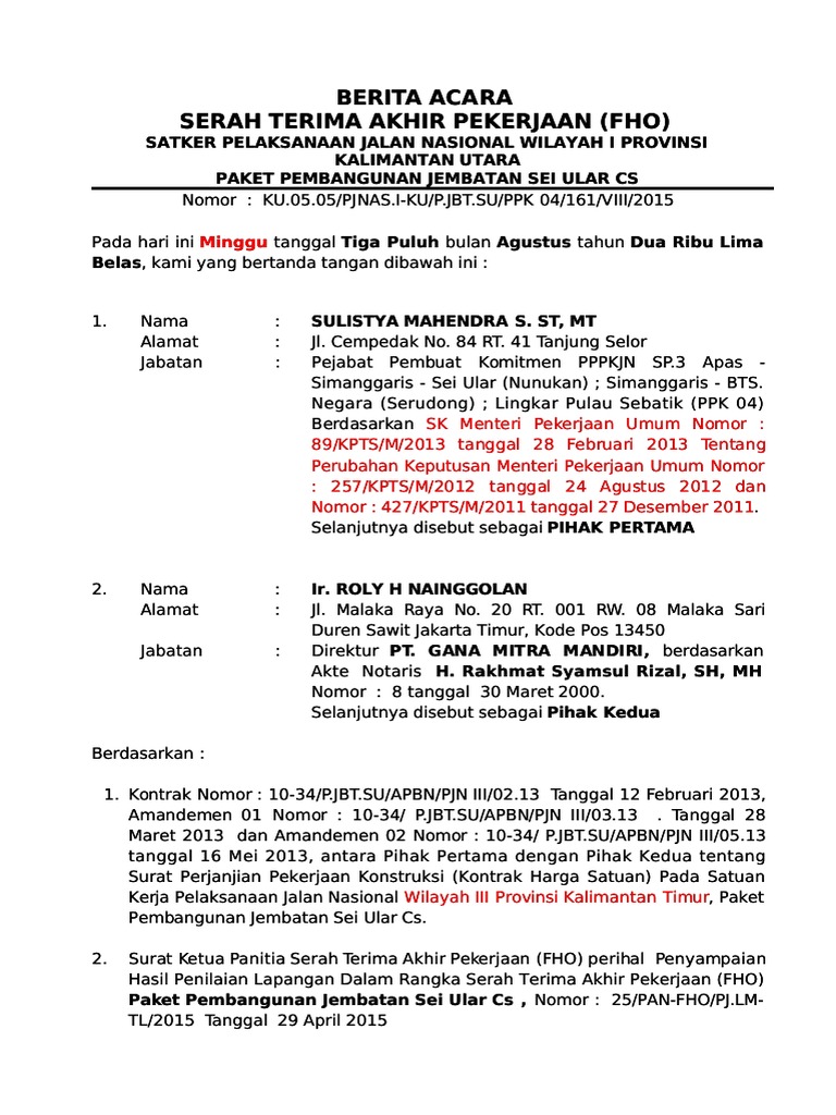 Selama masa pemeliharaan pihak kedua wajib memelihara hasil pekerjaan tersebutdemikian berita acara serah terima pertama pekerjaan pho ini dibuat dengan sebenarnya dalamrangkap 10 sepuluh dan 3 tiga rangkap diantaranya dibubuhi materai rp. Mungkin bpk punya contoh format kedua berita acara tersebut. Dokumen kontrak bab iv syarat syarat umum kontrak pasal 48. Surat ketua panitia serah terima akhir pekerjaan fho perihal penyampaian hasil penilaian lapangan dalam rangka serah terima akhir pekerjaan fho paket pembangunan jembatan sei ular cs nomor. Adapun pada saat proses penyerahan akhir hasil pekerjaan ini kelengkapan dokumen yang harus dilengkapi adalah sebagai berikut. Mengetahui berita acara memang sangat penting terutama bagi anda yang berhubugan dengan banyak orang atau terkait pekerjaan.
