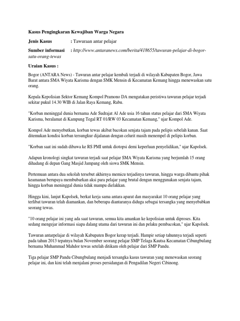 Contoh berita kasus pengingkaran kewajiban warga negara. Kewajiban untuk ikut serta mencapai tujuan pembangunan nasional tersebut terdapat dalam uu nomor 20 tahun 2003 tentang kewajiban warga negara. Nah coba sekarang renungkanlah hal hal berikut serta cobalah berikan jawabannya. Contoh pelanggaran hak dan pengingkaran kewajiban sebagai warga negara pelanggaran hak warga negara adalah tindakan aparat negara yang melanggar atau tidak memberikan apa yang menjadi hak warga negara contoh kasus berita pelanggaran hak contoh. Hak warga untuk mendapat pelayanan kesehatan itu kewajiban negara negara bertanggung jawab atas kesejahteraan sosial ujar jimly dalam konferensi pers yang digelar di kantor icmi jalan. Fdnvan amnesty international kasus. Posting pada sd ditag akibat pengingkaran kewajiban membayar pajak berikut beberapa sifat kewajiban kecuali berita tentang hak dan kewajiban warga negara berita terkini tentang hak dan kewajiban contoh kasus hukum perjanjian dan penyelesaiannya contoh kasus pasal 26 ayat 1 contoh kasus pelanggaran hak contoh kasus perjanjian kontrak contoh kasus perjanjian usaha contoh kewajiban dalam.