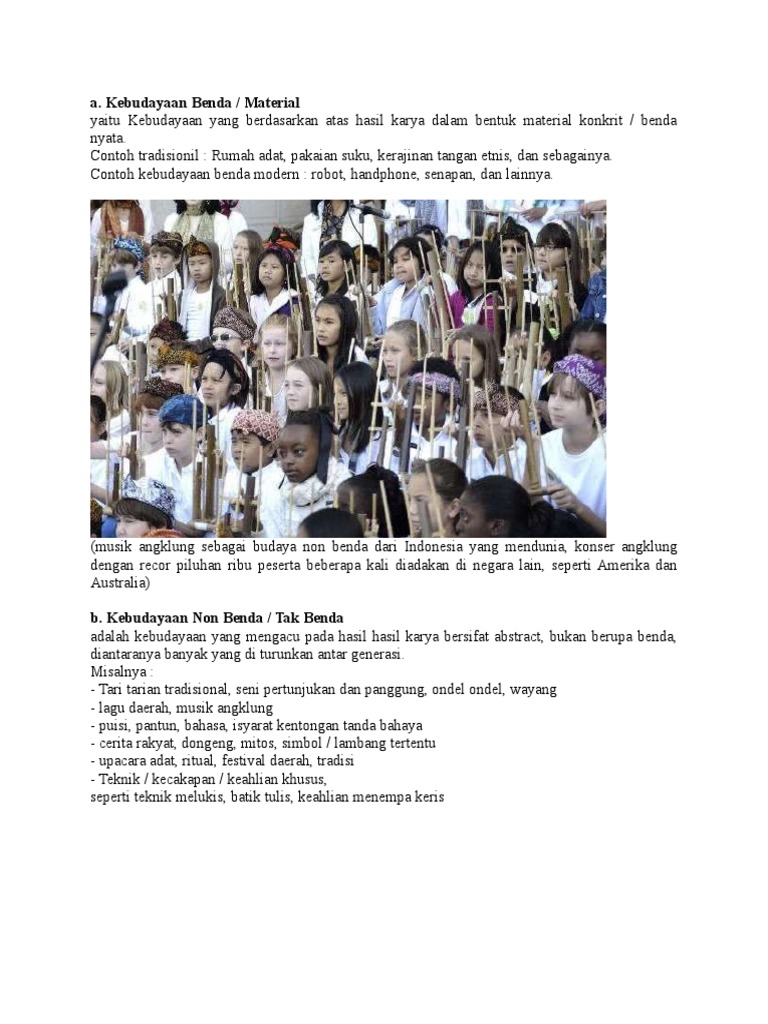Usaha berarti perbuatan amal bekerja berbuat sesuatu. Gerakan kompak dari penari ini melambangkan jiwa persatuan dan gotong royong yang tertanam dalam budaya masyarakat maluku. Berikut adalah daftar rincian jumlah wbtb indonesia yang telah ditetapkan. Contoh benda padat menjadi cari. Secara umum budaya dibedakan menjadi 2 yaitu budaya daerah dan budaya nasional. Budaya non benda contohnya sebagai berikut.