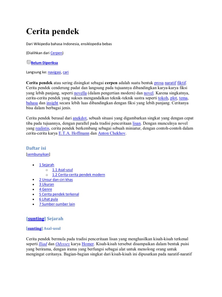 Contoh cerita pendek bahasa indonesia. Contoh cerpen cerpen atau cerita pendek bukanlah hal yang asing di tengah tengah kehidupan. Selain itu cerpen atau cerita pendek cenderung padat dan langsung pada tujuannya jika dibandingkan karya karya fiksi lain yang lebih panjang seperti novella novel. Contoh cerpen lucu tamat baca juga. 10 contoh cerita binatang dalam bahasa inggris dan artinya terbaru cerita binatang dalam bahasa inggris yang biasa termasuk dalam narative text sangat membantu sahabat sahabat sbi untuk menguasai skill dalam bahasa inggris khususnya reading skill. Kenapa tidak mencari di internet saja kan banyak sekali berbagai contoh cerita pendek yang bisa dipelajari. Cerpen atau cerita pendek adalah bentuk prosa naratif fiktifcerita pendek cenderung padat dan langsung pada tujuannya dibandingkan karya karya fiksi lain yang lebih panjang seperti novella dalam pengertian modern dan novelkarena singkatnya cerita cerita pendek yang sukses mengandalkan teknik teknik sastra seperti tokoh plot tema bahasa dan insight secara lebih luas dibandingkan.