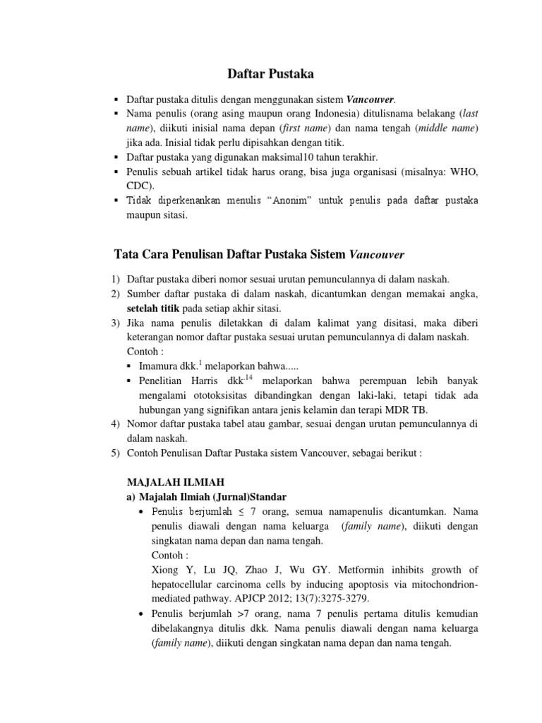 Cara menulis daftar pustaka dengan metode vancouver akan saya tuliskan dalam postingan kali inihal ini sebagai kelanjutan dari postingan saya sebelumnya tentang cara menulis daftar pustaka dengan metode harvard. Diagnosis malaria dapat ditetapkan secara mikroskopik dengan pewarnaan giemsa1 acridine orange2 dan elisa. Ismid1 hadidjaja2 dan margono3 menyatakan bahwa prevalensi askariasis di indonesia cukup tinggi. Contoh nomor kutipan ditulis superskripnomor diletakkan setelah kutipan.