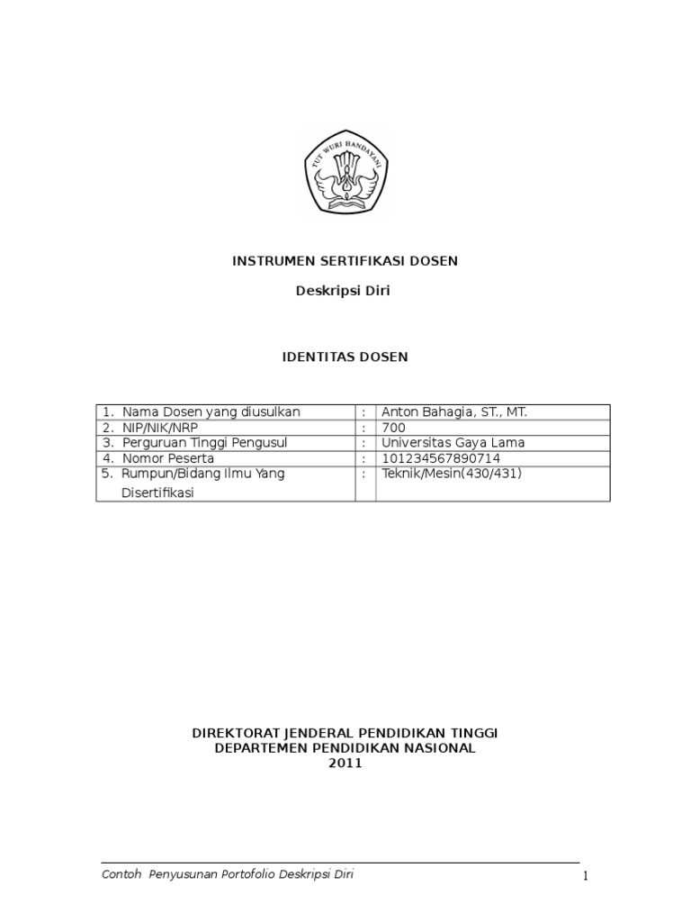 Contoh deskripsi diri serdos. Bingung menulis deskripsi dosen yang disyaratkan untuk mendapatkan sertifikasi dosen. Sistem administrasi sertifikasi dosen serdosdiktigoid instrumen sertifikasi dosen deskripsi diri identitas diri li direktorat jenderal pendidikan tinggi kementerian pendidikan dan kebudayaan 2017 lampiran pv 1. Dan semua proses dilakukan melalui sistem di website serdos ristekdikti. June 9 2017 october 23 2019 robby yuli endra 8 comments contoh deskripsi diri serdos contoh serdos deskripsi serdos tips menulis serdos tetapi untuk mengikuti seleksi untuk mendapatkan serdos tidak mudah banyak hal yang harus terpenuhi baik syarat syarat administratif atau pun syarat penilaian. Contoh deskripsi diri serdos 2015sutarto. Contoh dokumen deskripsi diri sebagai salah satu komponen penilaian sertifikasi dosen serdos 2015 alarm daihatsu ayla x elegant tiba tiba tidak bunyi klakson dan sign tidak nyala doa ku setiap hari sebelum memulai semua aktifitas.