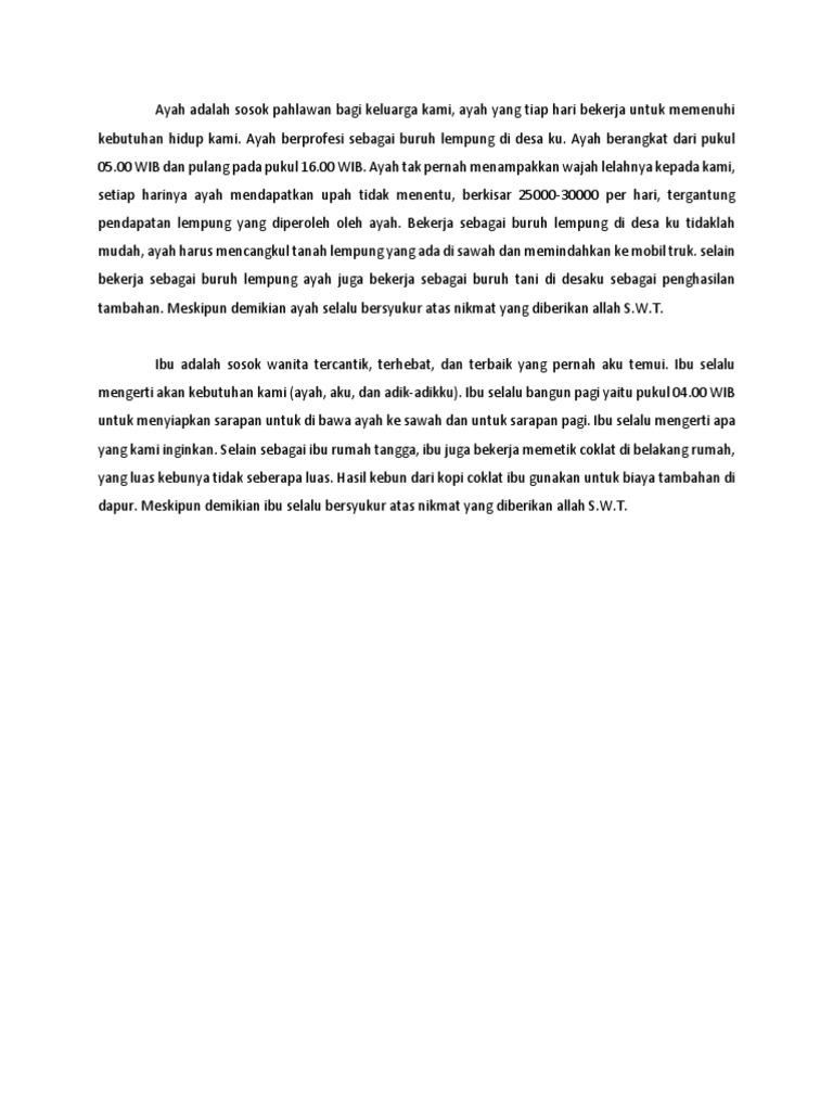 Dalam teks ini penulis berupaya untuk membuat pembaca seolah olah berada tepat di depan obyek tersebut dan merasakan perasaan yang sama seperti yang dirasakan. Mother is a person that born us in the world. Untuk membuat sebuah teks deskripsi bahasa inggris kamu harus tahu seluk beluk dari sebuah obyek. 5 contoh puisi bahasa inggris tentang ayah beserta artinya. Contoh karangan ibu deskripsi narasi argumentasi persuasi singkat ibu merupakan sosok wanita yang sangat berjasa. Tak hanya hewan peliharaan atau benda kesayangan seseorang tercinta di keluarga pun bisa jadi bahan atau topik pada sebuah teks deskripsi.