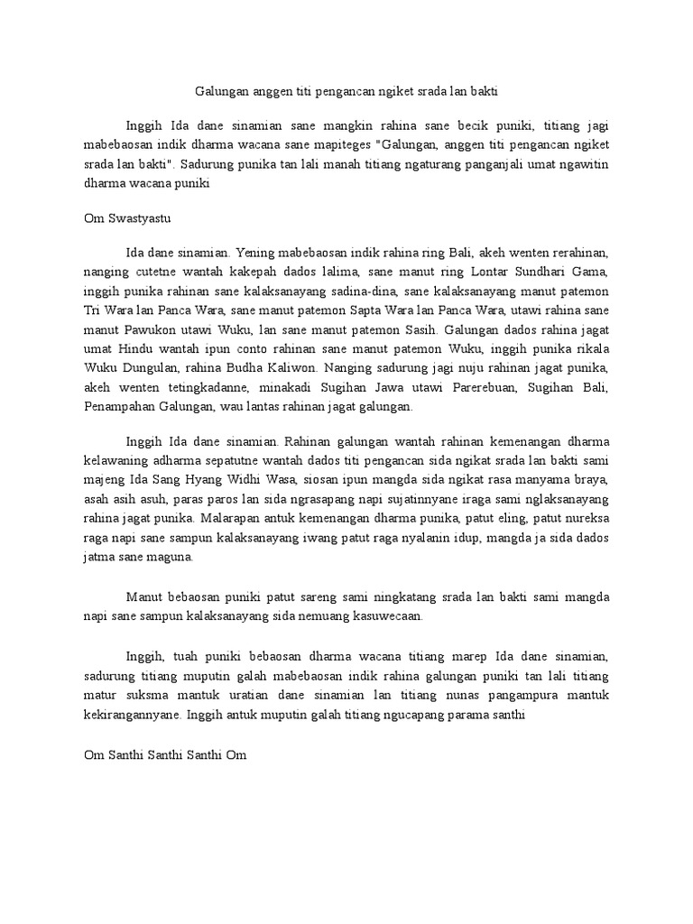 Contoh dharma wacana bahasa bali. Disampaikan pada setiap kesempatan umat hindu melaksanakan kegiatan yang berkaitan dengan keagamaan bisa dikatakan dharma wacana itu sama dengan pidarta atau pidato hanya saja cara pembawaannya lebih lembut. Dharma sedana inggih suksma aturang titiang mungguing galah sane kapaica ring sikian titiang sadurung titiang ngelantur pacang matur ring ida dane sareng sami lugrayang titiang ngaturang pangastunkara om swastiastu dane jro mangku sane suciang titiang bapak manggala sekolah sane mustikayang titiang para dang acarya sane subaktinin titiang para sisya lanag istri sane tresna sihin titiang. Berikut ini saya akan share contoh teks dharma wacana dengan tema budaya bali semoga bermanfaat swadharmaning yowana sane pacang ngajegang budaya bali antuk maparilaksana nganutin sesana sadurung nglantur lugrayang titiang ngastiti ring ida hyang widhi wasa antuk ngaturang pangastungkara panganjali umat. Dharma wacana inggih punika wacana sane madaging indik agama sane kabaktayang ring umat hindu manut ring kahanan bantang wangun jenis karya keagamaan genah galahkala lan patra. Dharma wacana teges dharma wacana. Untuk membuat dharma wacana yang baik memang dibutuhkan latihan berkali kali.