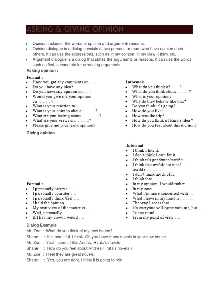 Kumpulan kata asking and giving opinion meminta dan memberi pendapat dalam bahasa inggris beserta contoh dialog setelah membahas mengenai opini dan fakta pada materi sebelumnya kali ini kita akan. Pengertian dan contoh dialog terbaru asking and giving opinion ketika kita sedang berbincang bincang dengan teman kita tau keluarga kita banyak hal yang sering kita bicarakan salah satunya adalah menanyakan sebuah pendapat tentang suatu berita yang sedang hot topik ataupun sekedar menayakan pendapat tentang kepunyaaan orang. Well i think its ok. Dialog bahasa inggris asking and giving opinion. Discussing a bands new music album. Itu tadi contoh dialog conversation bahasa inggris tentang asking and giving opinion.