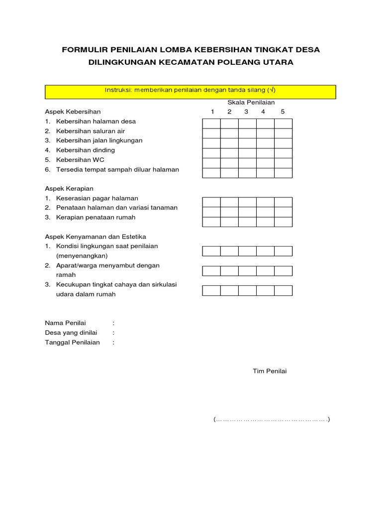 Brantas abipraya persero abtpraya persero pt brantas jld1panjaitan kav 14. Contoh format penilaian lomba kebersihan lingkungan. Form penilaian lomba kebersihan keindahan dan ketertiban lingkungan ormawa. Aspek indikator rubrik yang dievaluasi skor skor perolehan catatan 1 1 kebersihan dan kerapihan ruangan 1. Tidak ada sarang laba laba 5. Bengkalis dalam rangka meningkatkan kebersihan lingkungan desa dan keamanan pemerintah desa pedekik akan mengadakan lomba kebersihan dan keaktifan pos kamling antar rw tahun 2014.