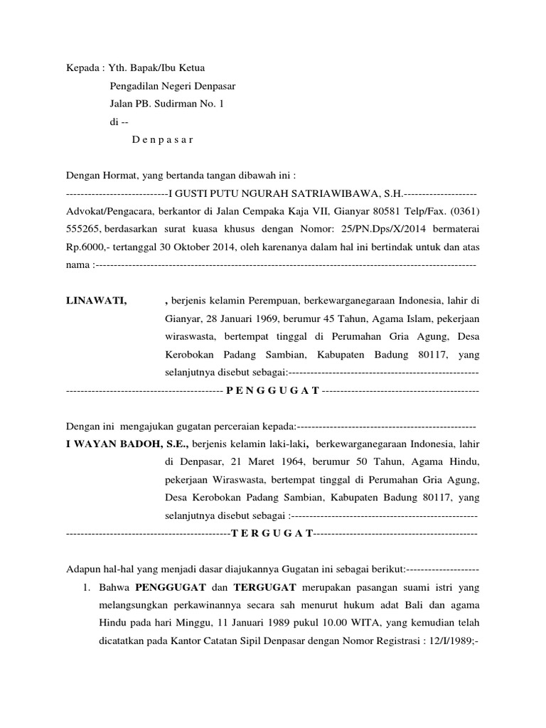 Demikian contoh surat gugatan cerai dan petunjuk pengisian yang telah kami buat semoga bisa memberikan manfaat bagi anda yang membutuhkan referensi pembuatan surat gugatan cerai yang baik dan benar. Contoh surat gugatan perdata perceraian di pengadilan negeri bagi awam surat gugatan adalah suatu surat yang diajukan oleh penggugat atau kuasa penggugat kepada ketua pengadilan yang dalam wilayah hukum pengadilan yang berwenang yang berisi dan memuat tuntutan tuntutan akan hak yang di dalamnya mengandung suatu sengketa dan juga merupakan dasar landasan pemeriksaan suatu perkara dan. Cara membuat surat gugatan perceraian di pengadilan negeri di dalam surat gugatan cerai di pengadilan negeri terdapat beberapa bagian surat yaitu. Contoh surat gugatan cerai. Contoh surat gugatan cerai di pengadilan negeri untuk mengajukan permohonan perceraian bagi yang beragama islam dapat diajukan ke pengadilan agama sedangkan khusus non muslim dapat diajukan di pengadilan negeri tempat berdomisili. Home e doc contoh format gugatan dan permohonan zona integritas pengadilan agama jakarta selatan pengadilan agama memberikan kemudahan akses informasi jadwal sidang untuk para pihak yang sedang berperkara.