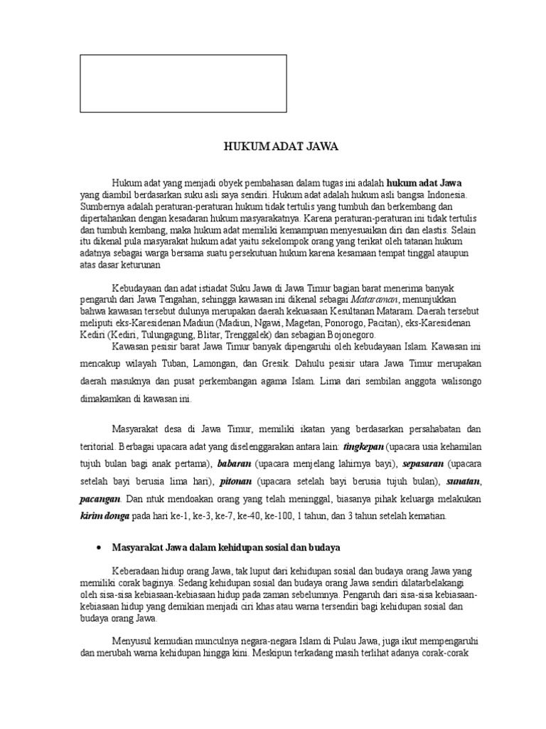 Contoh hukum adat jawa. Contoh hukum adat adalah sebuah bidang dalam hal ini juga disebut hukum konstitusional yang berasal dari pertukaran pabean antar negara dari waktu ke waktu yang didasarkan pada hubungan. Keunikan tersebut terdapat desain rangka atap yang memiliki bubungan lumayan tinggi. Sebagai berikut ini. Saudara tidak tinggal bersama secara langsung. Sumber hukum adat adalah peraturan peraturan yang tidak tertulis yang tumbuh dan berkembang dalam masyarakat dan dipertahankan. Saya akan memaparkan jenis jenis pada bangunan rumah adat jawa tengah.