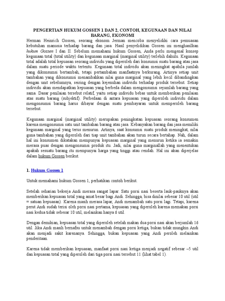 Contoh hukum gossen 1. Namun semakin lama rasa nikmat tersebut akan menurun dan mencapai batas jenuh. Bunyi dari hukum gossen 1 dan 2 tentang konsumsi gejala tambahan kepuasan yang tidak proporsional ini pertam kali dikemukakan oleh seorang ahli ekonomi jerman bernama herman heinrich gassen 1810 1859 yang dikenal dengan sebagai law of diminishing marginal utility hukum tambahan kepuasan yang terus menurun atau hukum gossen 1. Artikel ini membahas tentang pengertian bunyi rumus dan contoh penerapan hukum gossen 1 dan 2 dalam analisis perilaku ekonomi konsumen. Hukum gossen pertama merupakan generalisasi dari fakta berdasarkan pengalaman jika pemuasan keperluan terhadap suatu jenis benda tertentu dilakukakn terus menerus kenikmatannya akan terus menerus berkurang sampai akhirnya mencapai suatu kejenuhan. Hukum gossen 1 pertama merupakan generalisasi dari fakta berdasarkan pengalaman jika pemuasan keperluan terhadap suatu jenis benda tertentu dilakukakan terus menerus kenikmatannya akan terus menerus berkurang sampai akhirnya mencapai suatu kejenuhan. Law of diminishing marginal utility atau hukum gossen 1 menyatakan bahwa utilitas dari setiap unit dari suatu komoditas barangjasa akan berkurang secara berturut turut.