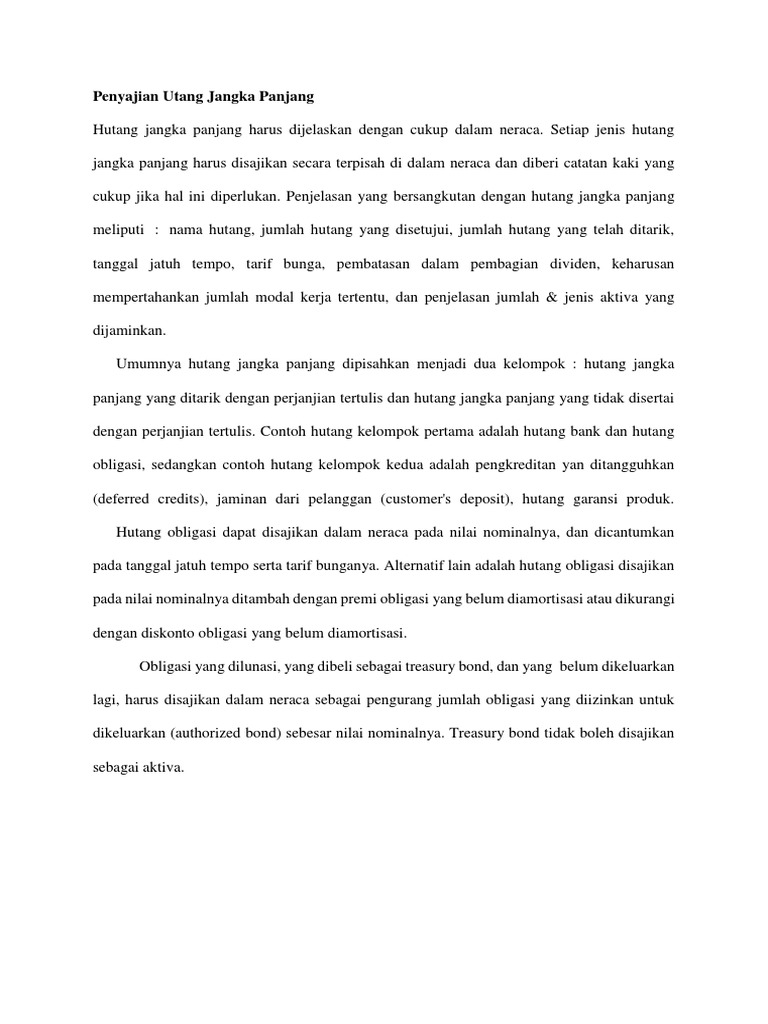 Pembayaran kemudian dilakukan menggunakan kas tetapi dapat diganti menggunakan aset tertentu. Karena emas mempunyai nilai atau harga yang selalu naik setiap tahun. Bagian dari hutang jangka panjang yang jatuh tempo atau harus dibayar dalam waktu 12 bulan harus digolongkan sebagai hutang jangka pendek. Terdapat berbagai macam sumber modal seperti kerjasama investor eksternal ataupun didapatkan dari kredit atau hutang. Hutang jangka jangka pendek masa pelunasannya kurang dari satu periode sedangkan hutang jangka panjang sebaliknya yakni lebih dari satu periode. Hutang obligasi kewajiban pension wesel bayar jangka panjang kewajiban lease hutang hipotik hutang jangka panjang memiliki berbagai ketentuan untuk melindungi baik peminjam maupun pemberi pinjaman yang dinyatakan dalam indenture obligasi perjanjian wesel.