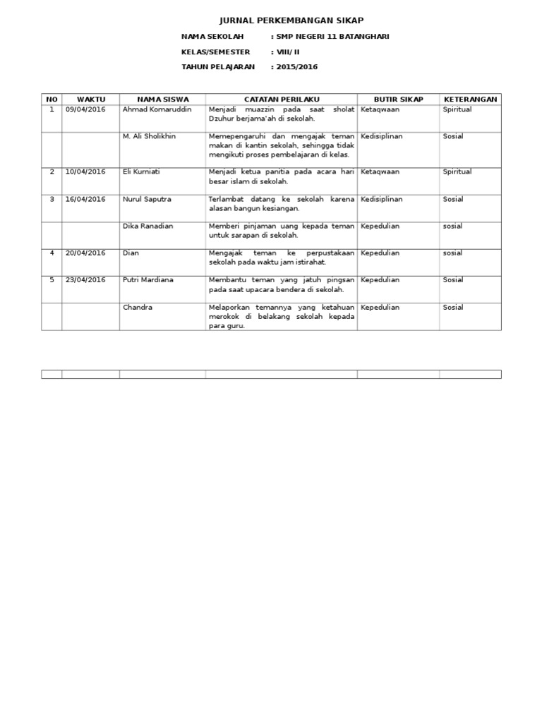 Contoh jurnal penilaian sikap spiritual. Berikut secara berturut turut menyajikan contoh jurnal penilaian sikap spiritual dan sikap sosial oleh wali kelas. Kompetensi tersebut dicapai melalui proses pembelajaran intrakurikuler kokurikuler danatau ekstrakurikuler. Namun sebelum ke aplikasi kita harus mengisi jurnal dulu dan perhatikan apa saja yang harus ada di dalam nilai sikap sosial dan spiritual. Contoh jurnal penilaian sikap dalam pembelajaran matematika tujuan kurikulum mencakup empat kompetensi yaitu 1 kompetensi sikap spiritual 2 sikap sosial 3 pengetahuan dan 4 keterampilan. Berdasarkan perilaku diri kalian selama pembelajaran dalam pada bab yang kita pelajari di 2 minggu ini nilailah sikap diri kalian sendiri dengan jujur. Adapun topik pembahasan yang akan dibagikan yaitu tentang contoh indikator penilaian sikap spiritual dan sikap sosial pada kurikulum 2013.