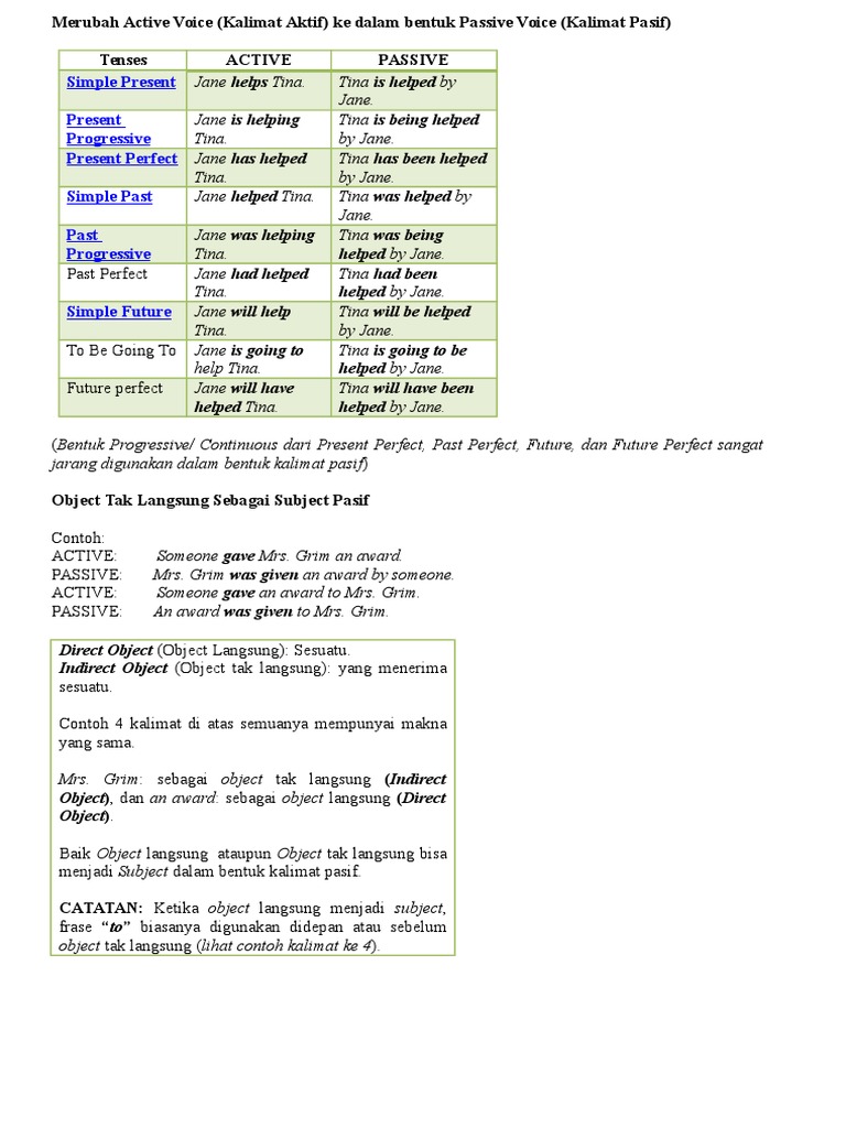 Contoh kalimat passive voice dan artinya. Kalimat pasif atau active voice dalam bahasa inggris terdiri dari dua unsur yaitu bentuk kata kerja to be yang sesuai past participle. Passive voice adalah jenis kalimat atau klausa di mana subjek menerima tindakan dari kata kerja. Sebaliknya pada konstruksi active subject berhubungan langsung dengan verb dengan bertindak sebagai pelaku aksi. Activea cake is being made by my mother. Passive the team has.