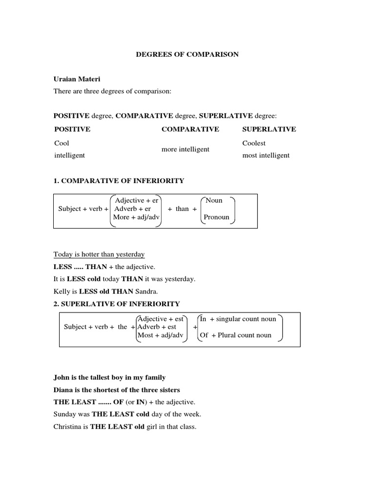 Contoh kalimat comparative degree. Berbeda dengan positive degree yang berfungsi untuk menyatakan kesetaraan comparative degree bertujuan untuk menyatakan keunggulan satu objek dibandingkan dengan objek lainnya oleh sebab itu ia memiliki makna lebih. Comparative degree istilah higher adalah comparative versi dari kata high. Salah satu cara untuk mengerti hal ini adalah dengan memahami contoh kalimat degree of comparison beserta artinya. Perubahan regular pada adjectives beserta contoh kalimat degree of comparison. Kedua kalimat diatas menyatakan arti yang sama. Comparative degree adalah membandingkan dua objek atau lebih.