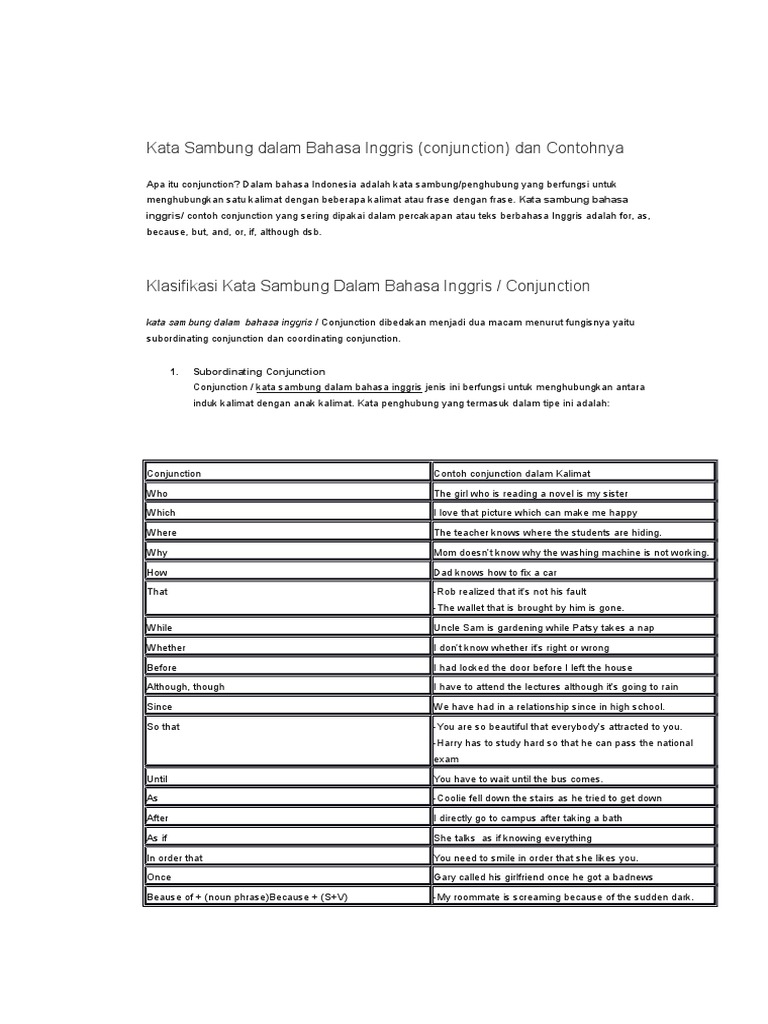 Kata penghubung atau konjungsi merupakan jenis kata yang fungsinya adalah untuk menghubungkan dua kata frasa klausa kalimat bahkan paragraf. Saat kebakaran itu terjadi rumah sedang kosong sehingga tidak ada korban yang terluka. Kata penghubung dalam bahasa inggris dan artinya artikel ini akan membahas lengkap seputar conjunction merupakan kata yang mengubungkan kata frasa klausa atau kalimat. Kalimat dapat dipisahkan menjadi dua buah kalimat tunggal atau lebih. Kata penghubung atau konjungsi memiliki jenis dan penggunaan yang berbeda beda dalam setiap kalimatnya yang tergantung pada konteks. Baik yang ia katakan maupun yang ia lakukan telah dimaafkan oleh penguasa.