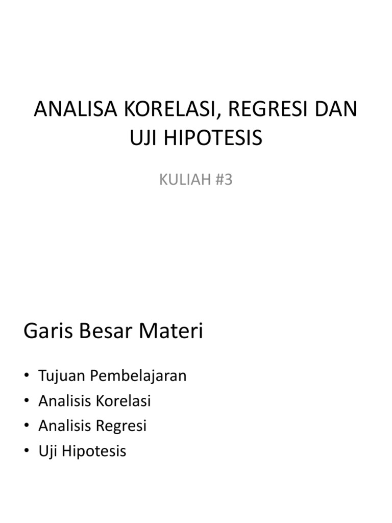Apa korelasi itu hal ini adalah salah satu hubungan teknik dengan menganalis statistic dengan mencari hubungan dari dua variabel dengan bentuk pada sifatnya sehingga terjadi lah hubungan pada sebab akibat yang. Regresi linier sederhana adalah suatu metode yang digunakan untuk melihat bentuk hubungan antar satu variabel independent bebas dan mempunyai hubungan garis lurus dengan variabel dependennya terikat. Istilahregresi yang berarti ramalan atau taksiran pertama kali diperkenalkan oleh sir francis galton pada tahun 1877. Sebuah variabel hasil observasi yang diperoleh sangat mungkin dipengaruhi oleh variabel lainnya misalkan tinggi badan dan berat badan seseorang. Pengertian dan contoh kasus uji regresi linear sederhana dan berganda regresi merupakan suatu alat ukur yang juga digunakan untuk mengukur ada atau tidaknya korelasi antarvariabel. Korelasi adalah salah satu teknik analisis dalam statistik yang digunakan untuk mencari hubungan antara dua variabel yang juga bersifat kuantitatif.