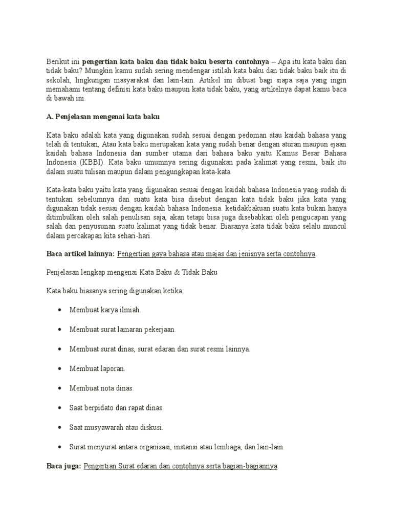 Nah itulah penjelasan mengenai pengertian kata baku dan kata tidak baku ciri beserta 362 contohnya semoga apa yang dipaparkan diatas dapat bermanfaat untuk anda semua. Sering merasa kebingungan dalam memahami kata baku dan tidak bakuinilah solusi untuk menambah wawasan anda dalam memakai kata kata sehari apakah baku atau tidak bakup engertian kata baku yaitu kata yang sesuai dengan aturan kaidah bahasa dan kata tidak baku berarti sebaliknya. Beberapa pembahasan dan contoh kata baku telah ditampilkan dalam beberapa artikel yang lalu.