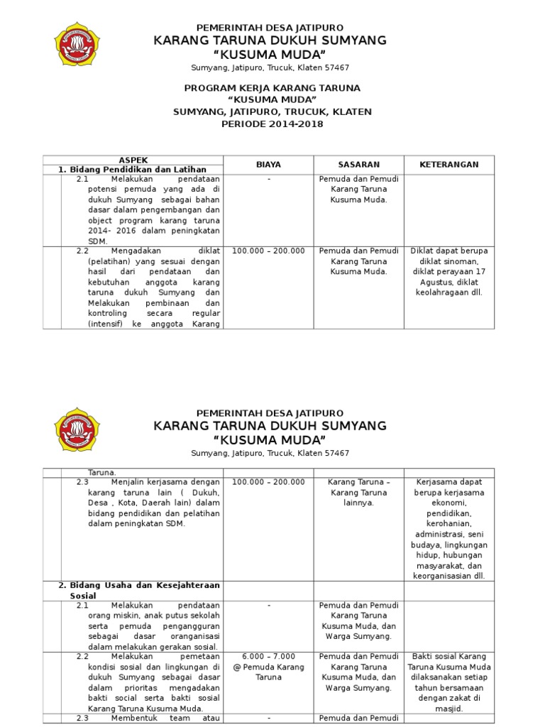 Menjalin kerjasama dengan karang taruna lain dalam bidang pendidikan dan pelatihan untuk meningkatkan sdm. Mengadakan kegiatan kegiatan yang positif agar generasi muda tidak terjebak dalam pergaulan yang negatif. Demikian proposal permohonan bantuan ini kami sampaikan. Terwujudnya pertumbuhan dan perkembangan kesadaran dan tanggung jawab sosial setiap generasi muda warga karang taruna dalam mencegah. Academiaedu is a platform for academics to share research papers. Karang tarunaadalah organisasi kepemudaan di indonesiakarang taruna merupakan wadah pengembangan generasi muda nonpartisan yang tumbuh atas dasar kesadaran dan rasa tanggung jawab sosial dari oleh dan untuk masyarakat khususnya generasi muda di wilayah desa kelurahan atau komunitas sosial sederajat yang terutama bergerak dibidang kesejahteraan sosial.
