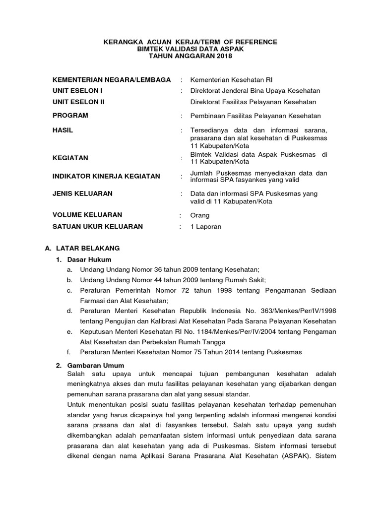 Contoh kerangka acuan kerja kegiatan bimtek. Tujuan kegiatan penyusunan standar biaya bertujuan memberikan acuan dan pedoman serta untuk mempermudah pelaksanaan proses penelaahan yang dilakukan. Peserta memahami dan menjadikan kode etik penyelenggara pemilu sebagai acuan dan pedoman dalam berperilaku dan bertindak. Penutup demikian kerangka acuan kegiatan ini dibuat untuk dapat dipergunakan sebagai pedoman dalam pelaksanaan kegiatan. Batasan kegiatan kegiatan bimbingan teknis pedoman penyusunan apbd tahun anggaran 2019 diperlukan sebagai acuan dan pedoman bagi pemerintah aceh dan pemerintah kabupatenkota dalam proses penyusunan apbd tahun 2019. Workshop pengelolaan dan pengembangan inkubator di jawa tengah view. Kerangka acuan kerja atau juga disebut term of reference tor pengadaan barang adalah suatu dokumen yang menginformasikan gambaran latar belakang tujuan ruang lingkup dan struktur sebuah proyek pengadaan barang yang telah disusun oleh skpddinas terkait.