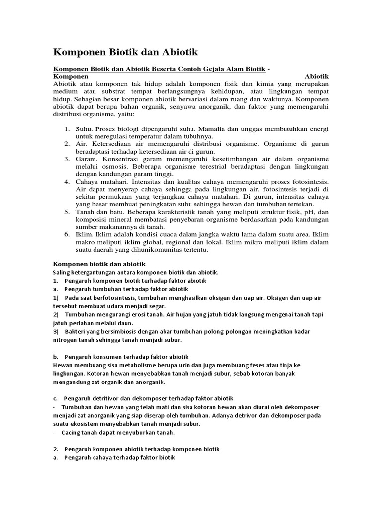 Contoh komponen biotik dan abiotik. Pengertian lingkungan biotik dan abiotik adalah topik yang kami ulas. Contoh komponen biotik dan abiotik faktor faktor abiotik mengacu pada unsur unsur non hidup fisik dan kimia dalam ekosistem. 9 contoh komponen biotik dan abiotik serta penjelasannya faktor abiotik adalah komponen fisik dan kimia tak hidup dari ekosistem sedangkan faktor biotik adalah komponen hidup dari ekosistem. Dalam artikel ini akan dijelaskan mengenai komponen biotik dan abiotik beserta contoh dan fungsinya. Semua komponen yang tidak hidup di suatu ekosistem dan berpengaruh terhadap kehidupan makhluk hidup termasuk kondisi di atmosfer dan sumber daya air dapat disebut sebagai komponen abiotik termasuk faktor fisika dan kimia yang ada di atmosfer substrat kejernihan air energi matahari pasang surut. Sumber daya abiotik biasanya diperoleh dari litosfer atmosfer hidrosfer dan.