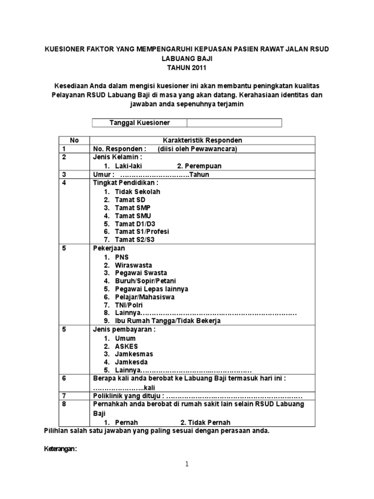 Contoh kuesioner kepuasan pasien rawat jalan. Studi tingkat kepuasan pasien rawat jalan terhadap pelayanan kefarmasian di rumah sakit umum palagimata kota bau bau palagimata kota bau bau diharapkan. Muito mais do que documentos. Kuesioner faktor yang mempengaruhi kepuasan pasien rawat jalan kode014 kuesioner penelitian pengetahuan faktor hubungan gambaran yang berhubungan. Bagaimana tingkat kepuasan pasien rawat jalan terhadap pelayanan kefarmasian di puskesmas oepoi ditinjau dari demnsi kehandalan dimensi ketanggapan dimensi jaminan dimensi empati dan dimensi penampilan. Kuesioner kepuasan pelanggan pasien rawat jalan pelanggan yang terhormat 1 kami mohon kiranya bapakibusaudara dapat meluangkan waktu untuk menjawab pertanyaan pertanyaan yang kami ajukan. Contoh kuesioner kepuasan pasien untuk di rs.