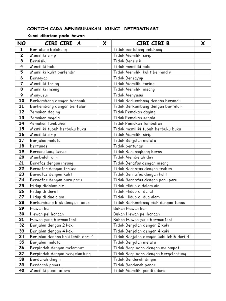 Contoh kunci determinasi tumbuhan lengkap. Biasanya berupa sebuah keterangan mengenai ciri ciri yang dimiliki oleh makhluk hidup. Pengertian dikotomi hewan dan tumbuhan lengkap kunci determinasi ialah suatu kunci yang dipakai untuk identifikasi makhluk hidup berupa keterangan wacana ciri ciri makhluk hidupidentifikasi merupakan aktivitas dasar dalam taksonomi. Cara membuat kunci determinasi. Kunci dikotom berisi deskripsi atau ciri ciri makhluk hidup yang terdiri dari dua baris dengan ciri yang kontradiktif atau berlawanan. Cara menggunakan kunci determinasi. Kunci determinasi dibuat secara bertahap sampai bangsa saja suku marga atau jenis dan seterusnya.