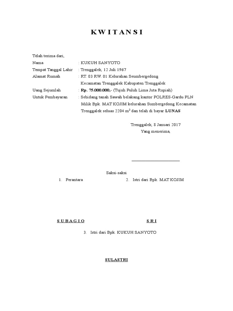 Ibu sri hartini pt. 1000000 satu juta rupiah untuk. Ada beberapa bentuk dan contoh kwitansi pembayaran yang sering kita jumpai dalam transaksi jual beli. Indonesia multi services sebesar. Kali ini kita akan berikan lebih banyak contoh surat perjanjian jual beli yang baik dan benar. Kwitansi jual beli tanah download format doc keberadaan kwitansi memang bukan rahasia umum lagi sejak jaman dahulu hingga saat ini keberadaan kwitansi sangat dibutuhkan didalam melakukan transaksi jual beli.