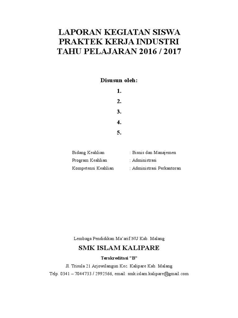 Contoh laporan prakerin buat kalian yang duduk di bangku sekolah menengah kejuruan pasti akan mengalami yang namanya praktik kerja industri prakerin atau biasa juga disebut praktik kerja lapangan pkl. Berikut ini adalah download 131 format administrasi kelas terbaru 2017 2018 yang merupakan kumpulan file dari berbagi sumber administrasiadministrasi guruadministrasi kelas tentang contoh laporan pkl untuk jurusan administrasi perkantoran yang bisa bapakibu gunakan dan diunduh secara gratis dengan menekan tombol download biru dibawah ini.