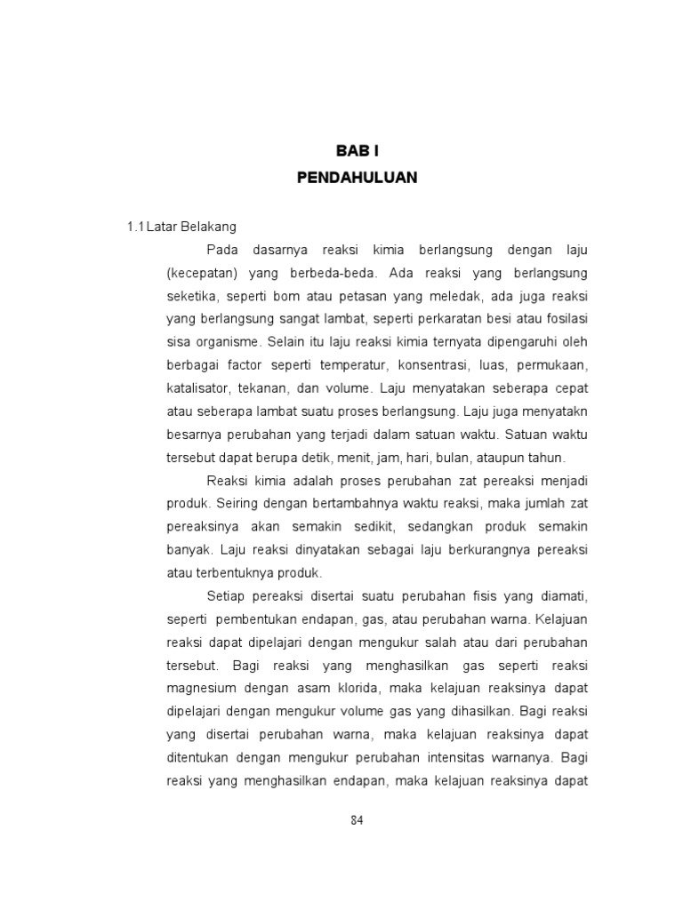Salah satu faktor yang mempengaruhi laju reaksi di antaranya adalah konsentrasi pereaksi. Laju reaksi dipengaruhi oleh luas permukaansemakin besar luas permukaan zat padat yang direaksikan semakin lambat laju reaksinyanamunsemakin kecil luas permukaan zat padat yang direaksikan semakin cepat laju reaksi yang terjadi. Kimia menggambarkan kehidupan sedemikian rupa sehingga. Perkaratan besi merupakan contoh reaksi kimia yang berlangsung lambat sedangkan peledakan mesiu atau kembang api adalah contoh reaksi yang cepat. Serta kita dapat mempelajari jenis reaksi kimia diantaranya yaitu reaksi penggabungan reaksi penguraian reaksi penggantian reaksi penggantian rangkap dan reaksi netralisasi. Laju reaksi adalah laju penurunan reaktan pereaksi atau laju bertambahnya produk hasil reaksi.