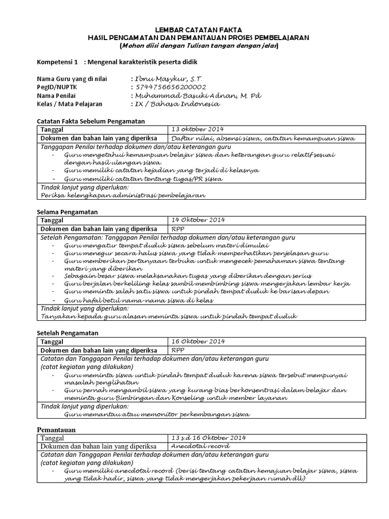 Contoh pengisian lembar catatan fakta hasil pengamatan dan pemantauan kinerja kepala sekolah pkks di padamu lembar catatan fakta. Lembar catatan fakta pkg merupakan lembar yang dibuat atau diisi oleh penilai pada saat melakukan pengamatan. Sebelum pengamatan tanggal 15 mei 2013 dokumen dan bahan lain yang diperiksa daftar nilai absensi siswa catatan kemampuan siswa. Lembar catatan fakta pkg merupakan lembar yang dibuat atau diisi oleh penilai pada saat melakukan pengamatan. Instrumen supervisi akademik yang digunakan sudah memenuhi standar. Admin blog temukan contoh 2019 juga mengumpulkan gambar gambar lainnya terkait contoh lembar catatan fakta hasil pengamatan dan pemantauan proses pembelajaran dibawah ini.