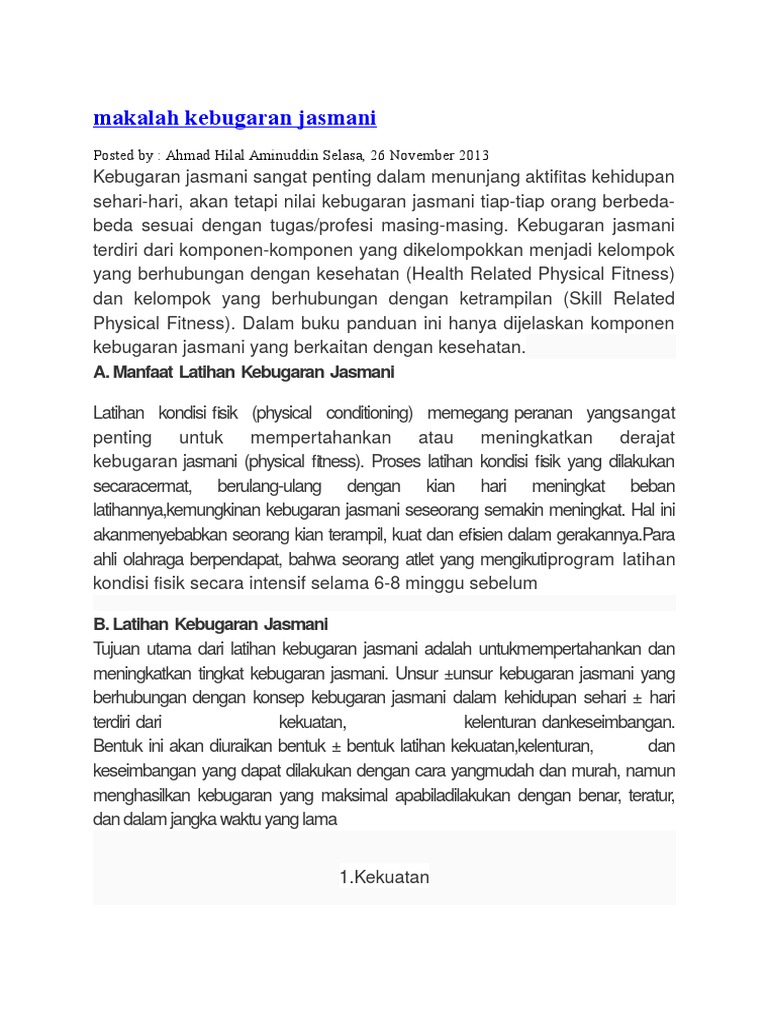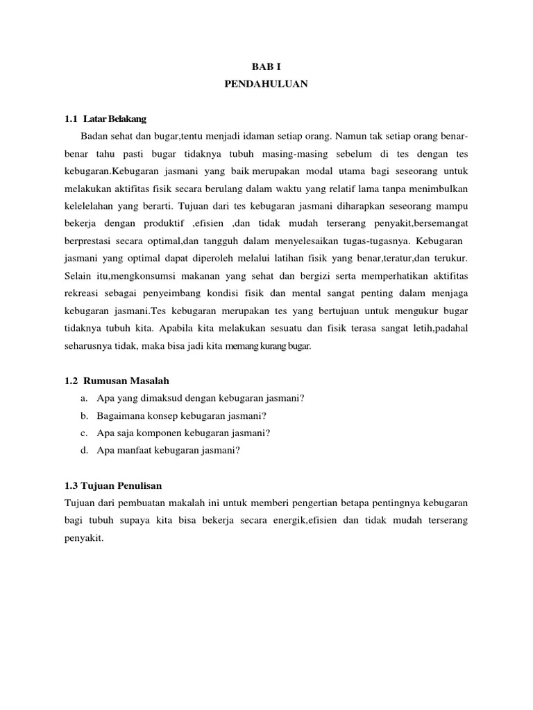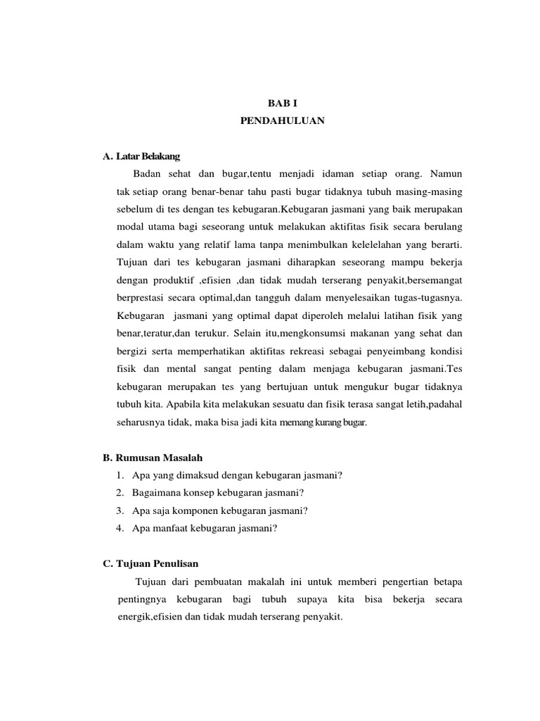 Contoh makalah kebugaran jasmani. Makalah kebugaran jasmani berikut ini akan memberikan penjelasan kebugaran jasmani dari segi pengertian komponen manfaat contoh tes dan bentuk latihan. Unsur unsur kebugaran jasmani yang berhubungan dengan konsep kebugaran jasmani dalam kehidupan sehari hari terdiri dari kekuatan kelenturan dan keseimbangan. Kebugaran jasmani pada hakekatnya manusia tentunya sangat perlu untuk memperhatikan kesehatan pada tubuh karena kesehatan adalah modal yang utama untuk melakukan aktifitas yang lainnya. Misalnya ketika kita mengantuk maka mata berhak untuk istirahat sejenak. Circuit training interval training jogging dan aerobic. Raya muncang cipanas lebak banten kata pengantar.