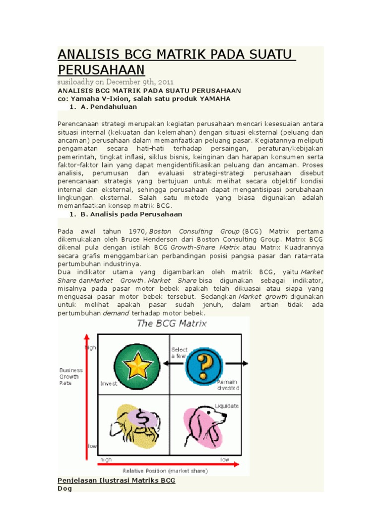 Strategi analisis swot pengertian matriks jenis komponen contoh. Bcg adalah kepanjangan dari boston consulting group merupakan perusahaan konsultan manajemen yang didirikan pada tahun 1963 dan memiliki 87 kantor di 45 negara termasuk indonesia. The bcg growth share matrix adalah empat sel 2 dari 2 matriks digunakan untuk melakukan analisis portofolio bisnis sebagai langkah dalam perencanaan strategis yang didesain secara spesifik untuk mendorong usaha perusahaan multidivisi dalam merumuskan strategi tersebut. Oleh karena itu kelancaran suatu perusahaan sangat tergantung pada manajemen dalam menyusun strategi pemasaran yang akan datang baik dalam jangka pendek maupun. Berikut sekilas pemahaman tentang model bcg disertai contoh pengerjaan. Bcg mempekerjakan 1400 konsultan di seluruh dunia tetapi sedang mengurangi pekerjanya sebanyak 12 persen di tahun 2002.