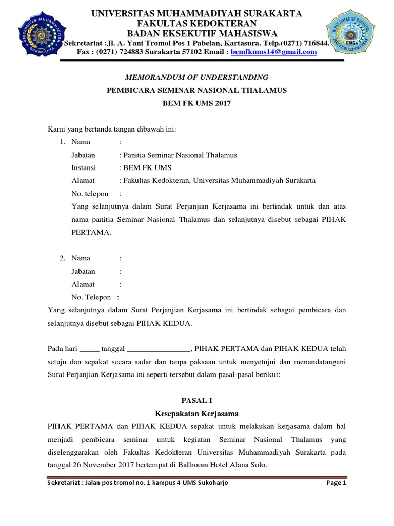 Perkembangan bisnis di indonesia sekarang ini sangat pesat karena munculnya para pembisnis muda yang sangat inovatif dan kreatif di segala bidang. An mou template contains an outline of the details and terms of the agreement. Nota ini dibuat sebagai langkah awal dalam membuat kontrak kerjasama perjanjian untuk mengikan kedua pihak yang bekerjasama. Pengertian memorandum of understanding mou nota kesepahaman yang dibuat antara subjek hukum yang satu dengan subjek hukum lainnya baik dalam suatu negara maupun antarnegara untuk melakukan kerjasama dalam berbagai aspek kehidupan dan jangka waktunya tertentu. Apalagi bisnis di bidang pakaian. Mou atau memorandum of understanding merupakan sebuah surat yang digunakan untuk melakukan kerjasama dari kedua belah pihak yang berbeda.