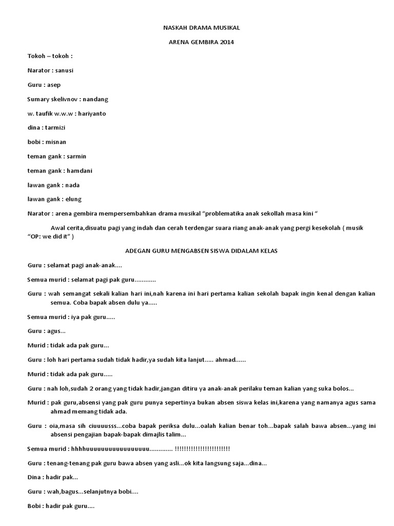 14 contoh naskah drama. Putih abu abu instrumen sahabat. Kini tayangan pertunjukan drama sudah berkembang menjadi semakin modern dan beragam tidak seperti pada masa lalu. Kalo jalan lihat lihat dong. Contoh naskah drama musikal sembilan orang sumber. Contoh naskah drama musikal sembilan orang rana merupakan salah satu siswi sebuah sma yang sangat berbakatdibidang seni musik dan sastra.