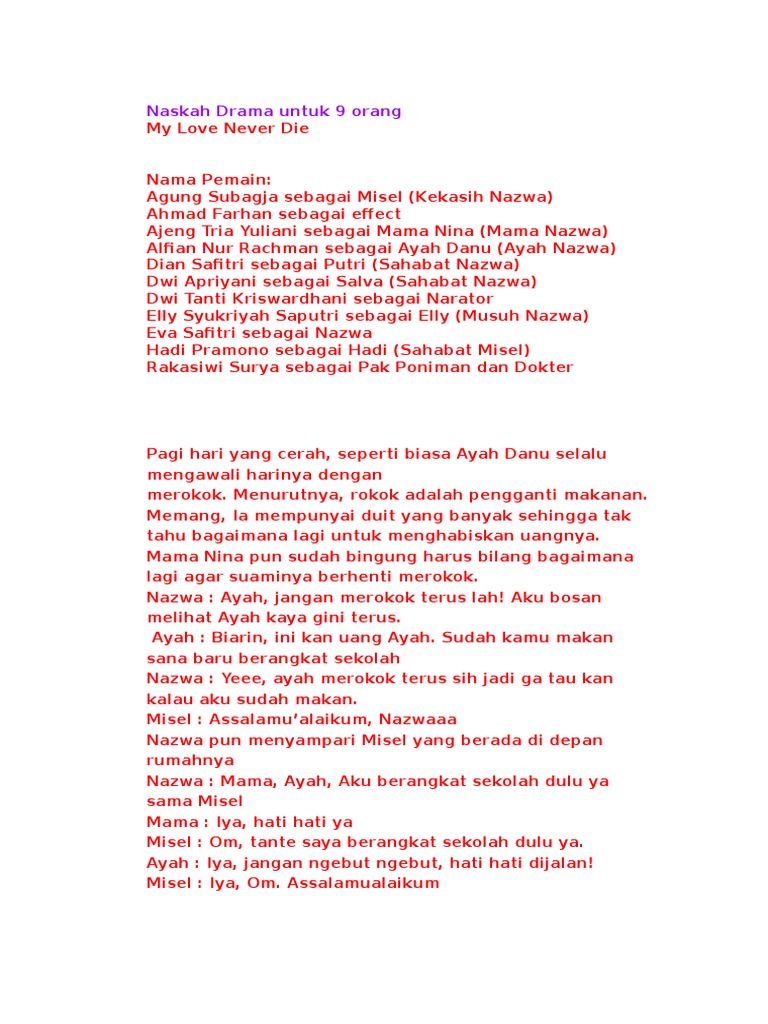 Contoh naskah drama untuk 9 orang. Tapi sebelum itu silahkan lihat juga beberapa naskah lain di bawah ini. Naskah drama 4 orang tema. Cocok untuk rekan pelajar semua. Seperti pada judul teks drama 9 orang pemain tersebut tentu berlatar belakang kehidupan siswa di sekolah. Posting pada uncategorized ditag contoh drama tentang ekonomi contoh naskah 3 paragraf contoh naskah drama 2 orang contoh naskah drama 5 orang tentang pendidikan singkat contoh naskah drama bahasa jawa 8 orang contoh naskah drama panjang 6 orang contoh naskah drama panjang untuk 10 orang contoh naskah drama satu babak pendek contoh. Drama adalah sebuah karya sastra yang ditulis dalam bentuk percakapan dialog atau obrolan yang nantinya akan dipentaskan atau dipertunjukkan di depan banyak orang.