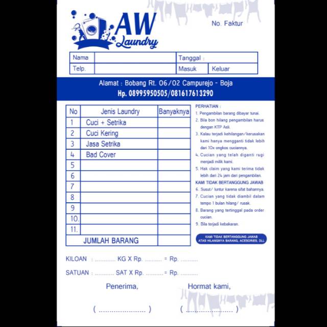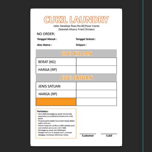 Salah satu ukuran nota laundry yang banyak digunakan adalah 165 cm x 105 cm 165 mm x 105 mm. Anggaran perencanaan bisnis laundry kiloan. Bonusnya adalah dua analisa usaha yang sedang menjamur ini. Tapi tidak ada salahnya membuat sendiri dengan memperhatikan contoh nota laundry yang sudah ada. Demikian beberapa contoh leflat dan brosur serta spanduk promosi laundry. Jika kamu sudah memulai usaha laundry maka pastikan perlengkapan harus disiapkan salah satunya adalah nota laundry ini.