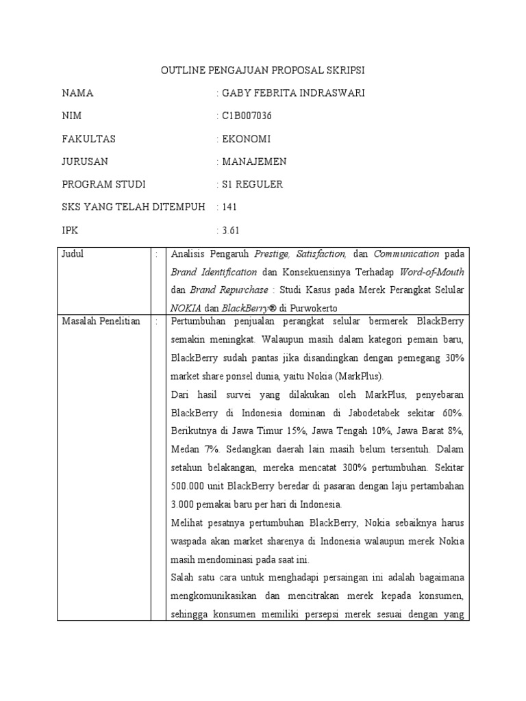 Academiaedu is a platform for academics to share research papers. Tapi kadang skripsi menjadi momok yang menakutkan untuk para mahasiswa terutama pada saat sidang ataupun takut salah pada saat menyusun skripsi. Koleksi skripsi ini dapetnya dari download di internet minta skripsi temen nyari2 di file rental komputer di seputaran kampus dan beli. Contoh outline skripsi form pengajuan judul outline proposal penelitian skripsi jurusan manajemen. Bukan hanya perihal penelitian atau kesulitan menemui dosen tapi juga perihal cara penulisan skripsi yang baik dan benar. Contoh outline skripsi dan pengertian outline skripsi adalah merupakan bahan dasar untuk membuat skripsi karena di dalamnya berisikan judul skripsi pendahuluan latar belakang tujuan penelitian dan hipotesis tinjauan pustaka dan bahan dan metoda penelitian yang akan di laksanakan untuk skripsi.