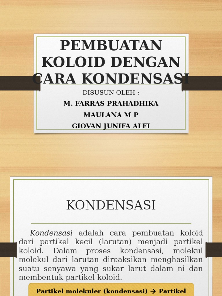 Pembuatan koloid dengan cara kondensasi dan dispersi sistem contoh reaksi praktikum kimia sistem koloid dapat dibuat dengan pengelompokan agregasi partikel larutan sejati atau menghaluskan bahan dalam bentuk kasar kemudian diaduk dengan medium pendispersi. Cara kondensasi ini merupakan cara kimia misalnya. Berikut adalah 6 contoh pembuatan koloid dengan cara kondensasi dalam kehidupan sehari hari. Sol agci dibuat dengan cara mencampurkan larutan agn0 3 encer dengan larutan hci encer atau naci encer.