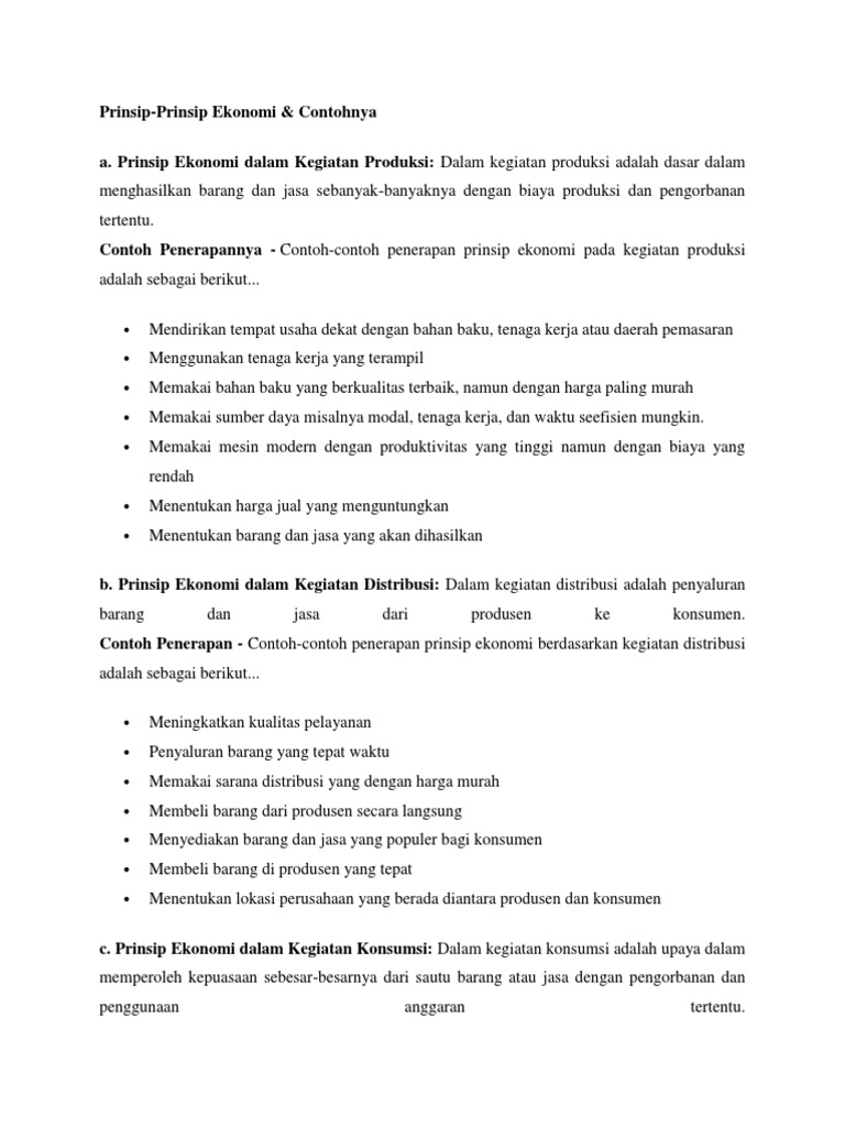 Kelangkaan barang dan jasa serta banyaknya faktor yang mempengaruhi kebutuhan manusia mendorong kita untuk menerapkan prinsip ekonomi dalam kehidupan sehari hari. Memilih barang yang awet dan tahan. Prinsip ekonomi adalah prinsip dasar yang bisa diterapkan dalam tiga kegiatan ekonomi yaitu kegiatan produksi konsumsi dan distribusi. Dalam kegiatan sehari hari secara sadar atau tidak kita juga menerapkan prinsip ekonomi. Contoh penerapan prinsip ekonomi dalam kegiatan distribusi. Prinsip ekonomi dalam kegiatan konsumsi.