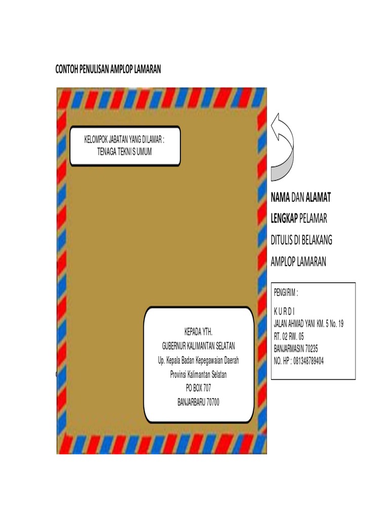 Contoh penulisan amplop surat lamaran kerja populasi penduduk yang meningkat setiap tahunnya tak ayal menjadi pr tersendiri bagi rakyat dan pemerintah. Keterbatasan pengetahuan serta pola pikir yang masih monoton seringkali menghambat seseorang untuk segera memperoleh pekerjaan yang bisa menjamin. Artikel makalah tentang amplop lamaran kerja meliputi dari definisi penulisan standard cara contoh dan gambar supaya mudah di pahami. Setelah kita bahas mengenai tips menulis surat lamaran kerja pada artikel sebelumnya kali ini penulis akan membahas seputar tips menulis alamat pada amplop lamaran kerja. Pada saat kita bermaksud ingin memberikan surat lamaran kerja ke sebuah perusahaan tentunya harus disertai dengan amplop suratnya agar terlihat lebih profesional dan mengesahkan penulisan amplop lamaran kerja juga tidak dapat ditulis dengan sembarangan kita harus membuatnya sesuai dengan format penulisan yang baik dan benar dengan bahasa eyd.