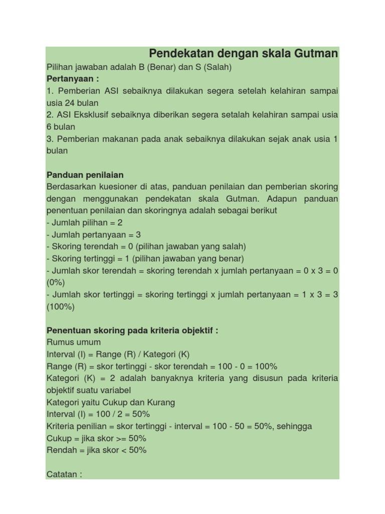 Contoh perhitungan skala guttman. Data yang diperoleh dapat berupa data interval atau rasio dikotomi dua alternatif. Pengertian atau definisi skala likert adalah skala yang digunakan untuk mengukur persepsi sikap atau pendapat seseorang atau kelompok mengenai sebuah peristiwa atau fenomena sosial berdasarkan definisi operasional yang telah ditetapkan oleh peneliti. Skala guttman disebut juga skala scalogram yang sangat baik untuk meyakinkan hasil penelitian mengenai kesatuan dimensi dan sikap atau sifat yang diteliti. Adapun skoring perhitungan responden dalam skala guttman adalah sebagai berikut. Skala ini merupakan suatu skala psikometrik yang biasa diaplikasikan dalam angket dan paling sering digunakan untuk riset yang berupa survei. Sangat tidak setuju.