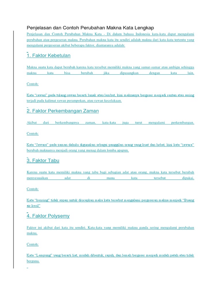 Kata ulang adalah bentuk kata yang diperoleh melalui proses reduplikasi atau pengulangan baik secara keseluruhan sebagian maupun perubahan. Pengertian dan contoh perubahan makna sinestesia kata bermakna dalam bahasa dan sastra indonesia tidak serta merta memiliki makna yang tetap. Perubahan makna kata terdapat 6 jenis perubahan arti antara lain. Salah satu contoh perubahan makna kata adalah meluas dan menyempitsekarang kita akan membahas tentang meluas dan menyempit. Kata buta dimaknai sebagai keterbatasan seseorang dalam menggunakan salah satu panca indera manusia yakni pada indera penglihatan. Makna kata bisa saja bergeser atau malah berubah karena faktor faktor tertentu.
