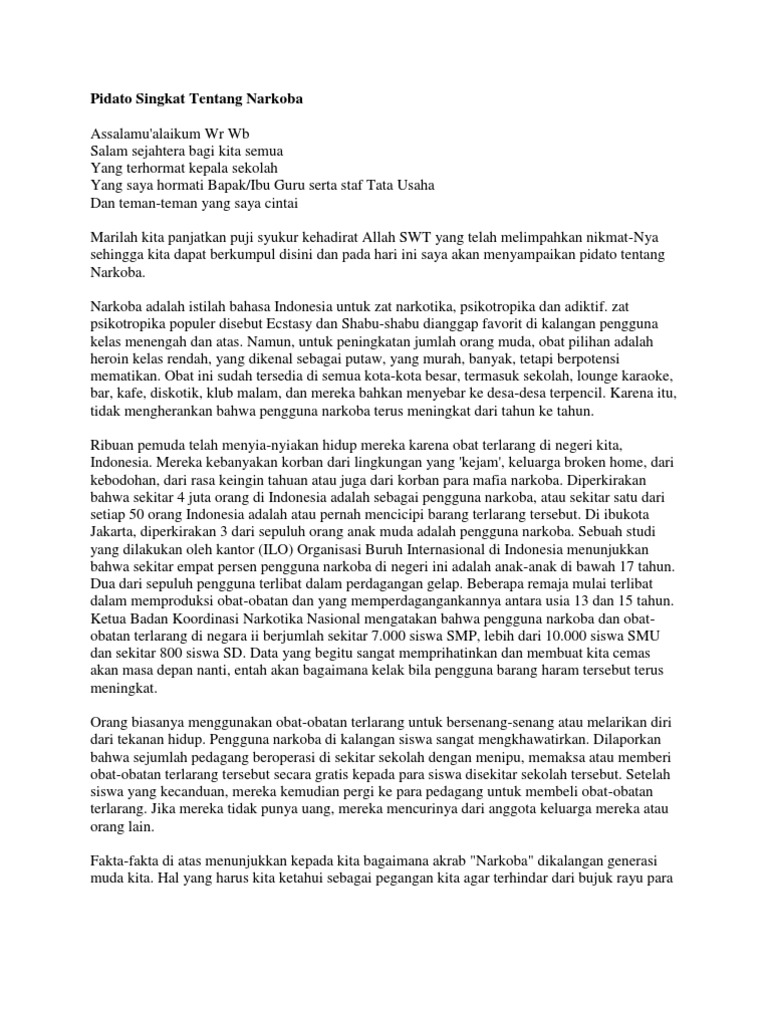Contoh pidato ini sebenarnya bisa diterapkan dalam aneka acara kepemudaan. Pidato tentang narkoba tema tentang narkoba tampaknya masih menjadi salah satu topik yang sering di ulas dalam berbagai kesempatan dan dari berbagai ruang lingkup yang berbeda tak terkecuali di lingkungan pelajar. Contoh pidato ini merupakan bagian dari upaya untuk mengantisipasi meluasnya peredaran narkoba dan narkotika khususnya di lingkungan pelajar tugas tugas sekolah seperti pembuatan naskah pidato narkoba atau bisa juga dengan pentas pentas seni dengan tema bahaya narkoba dan bisa juga melalui poster narkoba. Salah pergaulan sedikit bisa berakibat fatal. Tak heran kampanye bahaya narkoba digalakan pemerintah dan masyarakat. Contoh pidato ini ber tema narkoba judul.