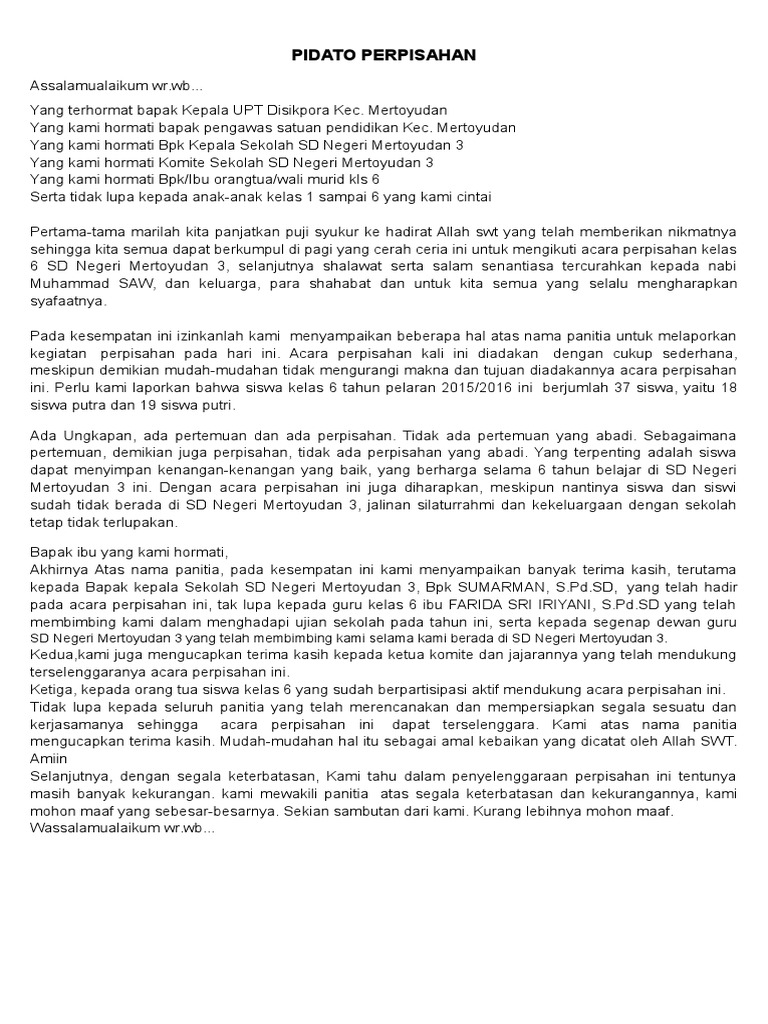 Contoh pidato perpisahan kelas 6. Pertama tama marilah kita panjatkan puji syukur kepada kehadirat allah swt atas limpahan karunia dan juga rahmat kita semua dapat hadir dan berkumpul di aula ini. Contoh pidato perpisahan kelas 6. Assalamu alaikum warahmatullahi wabarakatuh. Pidato perpisahan sekolah sekolahpidato perpisahan sekolah adalah kata sambutan yang berisikan tentang ucapan perpisahan yang disampaikan oleh siswa alumni kepada gurunya. Di bawah ini adalah contoh pidato perpisahan kelas 6 sd yang panjang singkat dan mudah dihafal yang dapat anda gunakan sebagai panduan untuk mempersiapkan naskah.