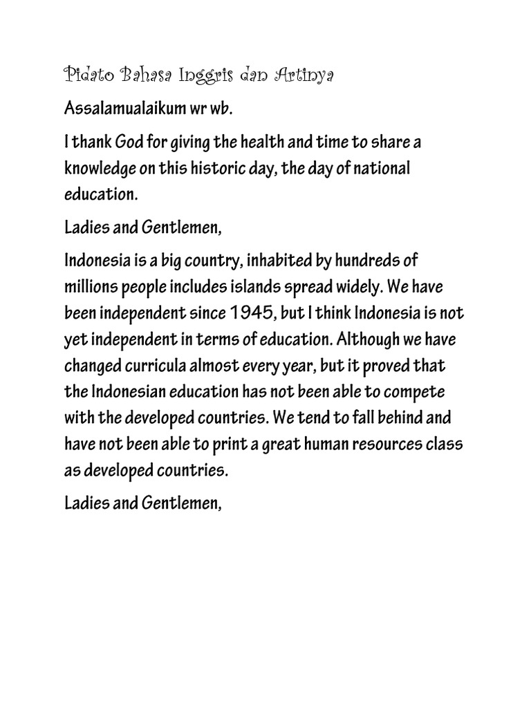 Contoh pidato singkat bahasa inggris beserta artinya. Contoh pidato bahasa inggris singkat tentang lingkungan dan artinya lingkungan adalah salah satu topik yang paling sering dipakai saat seseorang berpidato. Pidato biasanya memiliki fungsi untuk memberikan informasi ataupun mempengaruhi pendengar akan suatu sudut pandang tertentu pidato juga memiliki. Terkadang pidato bahasa inggris memang diperlukan untuk menyambut acara tertentu atau sebagai tugas wajib yang harus dikerjakan siswa dan mahasiswa. Demikianlah contoh pidato bahasa inggris yang bisa kami tampilkan untuk sementara ini. Saya hanya memberikan gambaran saja bagaimana membuat pidato bahasa inggris singkat dan padat. Contoh pidato bahasa inggris tentang pendidikan singkat dan artinya pendidikan saat ini adalah hal yang penting bagi semua orang.