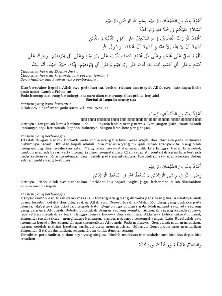 Nama tempat dll agar ceramah anda di depan umum menjadi lebih indah. Tentu saja cerita yang berkaitan dengan materi yang dibicarakan. Contoh ceramah tentang berbakti kepada orang tua bismillahirrohmaanirrohiim. Pidato berbakti kepada orang tua adalah contoh teksnaskah pidato pendidikan menggunakan bahasa indonesia.
